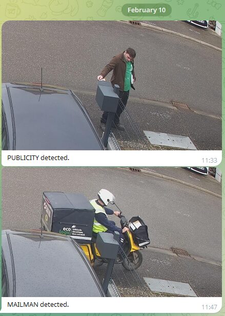 - The model is prompted to distinguish if the mailbox contains a letter, a parcel or publicity. It also looks at whether there actually was a person that did trigger the movement. A sensor is set accordingly. The prompt also indicates (using the heuristic logic for the 2 doors) whether it’s most likely letter sized or Parcel sized. This is typically to distinguish someone not wearing a (mailman) uniform delivering a parcel, and someone just putting publicity in the mailbox.