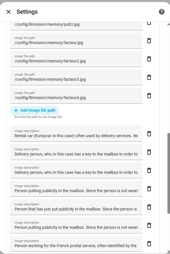 - The LLM Vision Integration has already been configured with the “memory” function: 6-7 photos of examples of different delivery types, with an explanatory text is sent to “train” the model.